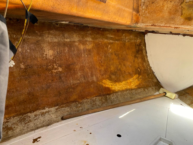 The hull has been blasted and the keel repaired with around 6mm of new epoxy glass, ready for fairing and finishing.